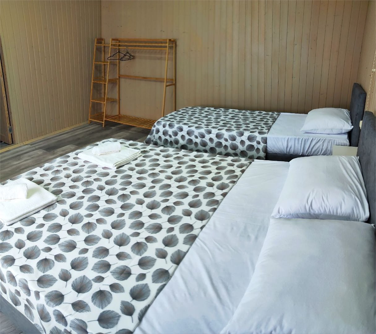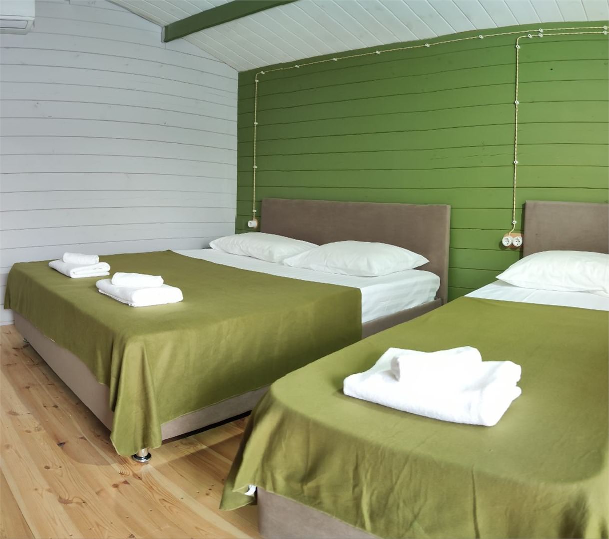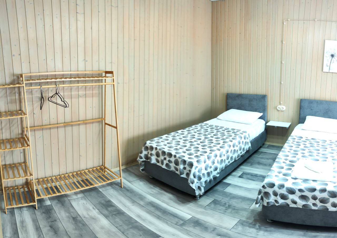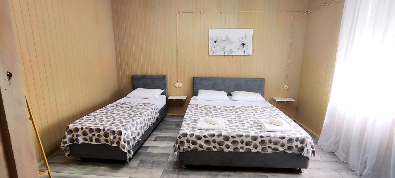 Площадь номера - 20 кв.м. 3 осн. места. 1 доп. место. Мебель: вешалка, зеркало, кровать двуспальная, кровать односпальная, прикроватные столики, стеллаж. Оборудование: кондиционер, телевизор, холодильник. Санузел. Сервис: Wi-Fi бесплатно, смена полотенец, смена постельного белья, уборка номера.